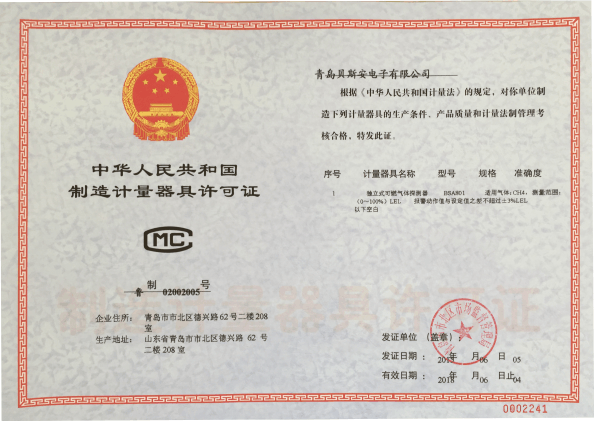 我公司是青島市具有國家質量技術監督部門頒發的計量器具生產許可證的生產企業;獲得國家防爆電氣產品質量監督檢驗中心頒發的防爆合格證;獲得國家公安部消防產品合格評定中心頒發的消防產品形式認可證書。